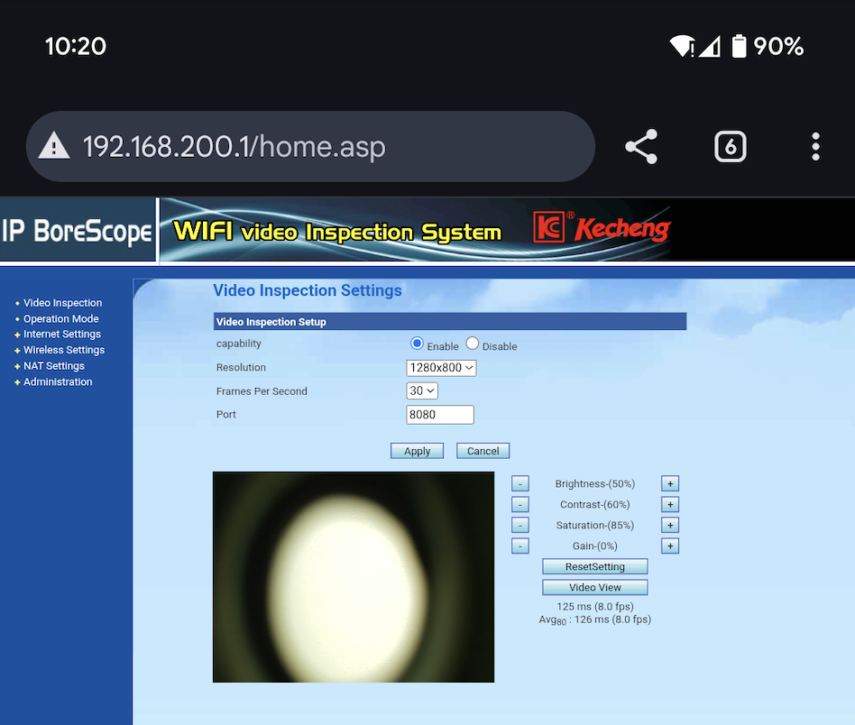 At this point, a new open WiFi network appeared called “IP BoreScope”. For some reason, I couldn’t connect to it from my Mac, but my Android phone connected to it with no problem.