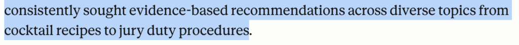 I always enjoy reading the ongoing profile Claude maintains as part of its memory feature. As with anything generated by a LLM, it tends to be a mixture of surprisingly great synthesis of my AI use and total whimsical nonsense.